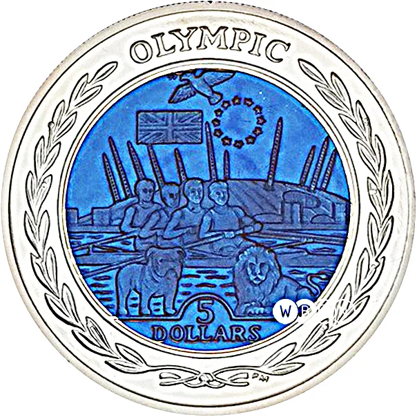 Queen portrait with crown, central monogram and flowers; country name and issue year on the ring.