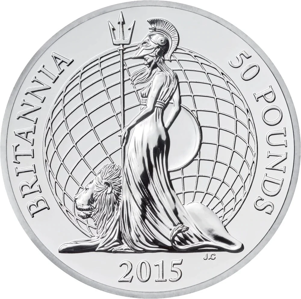 Britannia standing left with trident, shield, and lion at her feet, before a globe; legend around, date in exergue.