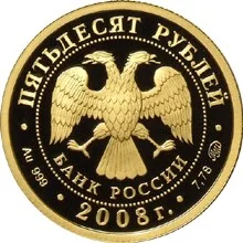 Center: Bank of Russia emblem (two-headed eagle, wings down, with "БАНК РОССИИ" below), within a dotted circle. Rim inscription: top - "ПЯТЬДЕСЯТ РУБЛЕЙ"; bottom left - metal and fineness; center - "2008 г."; bottom right - metal content and mint mark.
