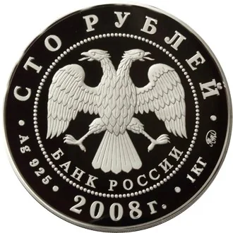 Center: Bank of Russia emblem (two-headed eagle, wings down, with "БАНК РОССИИ" below), circled by dots. Rim inscriptions: top - "СТО РУБЛЕЙ"; bottom left - metal and fineness; center - "2008 г."; bottom right - metal content and mint mark.