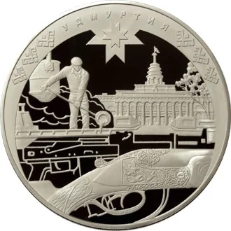 Left: a metallurgist at work. Right: the main building of the former Izhevsk Small Arms Factory. Below: an ornamented gun fragment, overlapped by the outline of a Kalashnikov submachine gun. Above: an eight-rayed solar sign on an ornamented matte field, encircled by "УДМУРТИЯ" (UDMURTIYA).