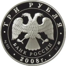 Central: Bank of Russia emblem (two-headed eagle, wings down, with "БАНК РОССИИ" below), encircled by dots. Rim inscription: top - "ТРИ РУБЛЯ"; bottom left - metal and fineness, centre - "2008 г.", right - metal content and mint mark.