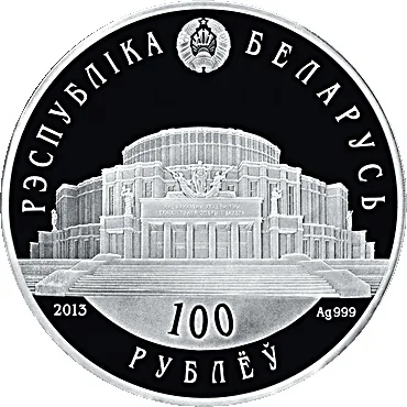 Description: Relief image of the State Coat of Arms above a central front view of the renovated National Academic Bolshoi Opera and Ballet Theatre. Circumferential inscriptions: "РЭСПУБЛİКА БЕЛАРУСЬ" at the top; the year of issue and alloy designation at the bottom.