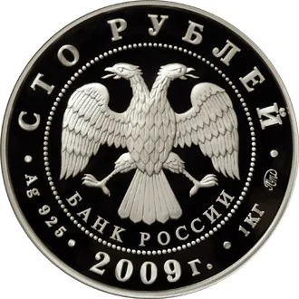 Center: Bank of Russia emblem (two-headed eagle, wings down, with "БАНК РОССИИ" below), within a dotted circle. Rim inscription: top - "СТО РУБЛЕЙ"; bottom left - metal and fineness; center - "2009 г."; bottom right - metal content and mint mark.