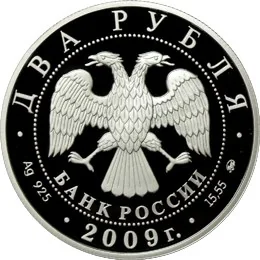Center: Bank of Russia emblem (two-headed eagle, wings down, with "БАНК РОССИИ" below), within a dotted circle. Rim inscriptions: top - "ДВА РУБЛЯ"; bottom left - metal and fineness; center - "2009 г."; bottom right - metal content and mint mark.