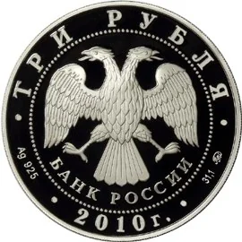 Center: Bank of Russia emblem (two-headed eagle, wings down, with "БАНК РОССИИ" below), within a dotted circle. Rim inscriptions: top - "ТРИ РУБЛЯ"; bottom left - metal and fineness; center - "2010 г."; bottom right - metal content and mint mark.