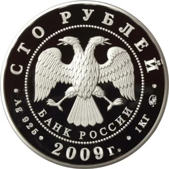Center: Bank of Russia emblem (two-headed eagle, wings down, with "БАНК РОССИИ" below), within a dotted circle. Rim inscription: top - "СТО РУБЛЕЙ"; bottom left - metal and fineness; center - "2009 г."; bottom right - metal content and mint mark.