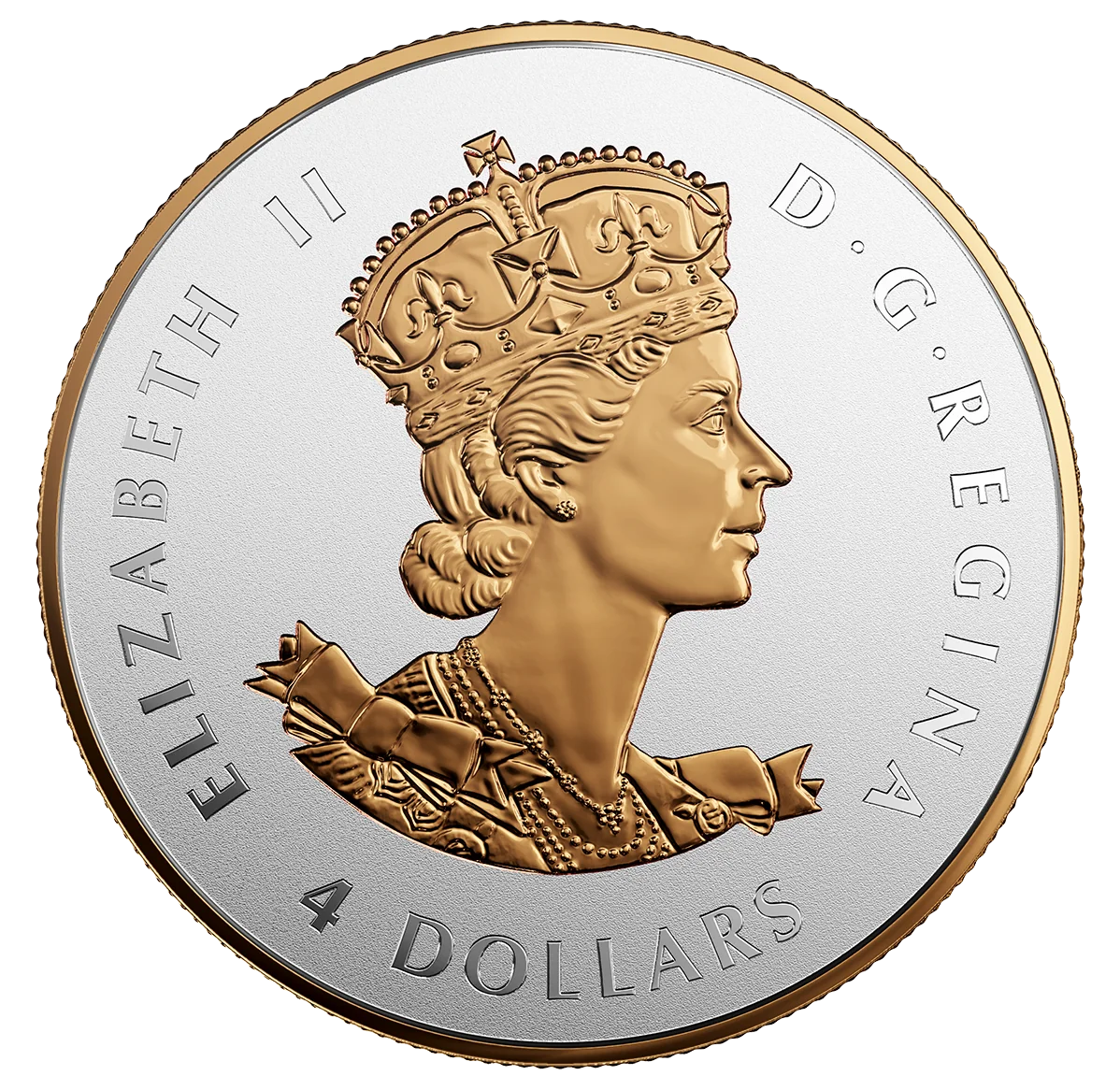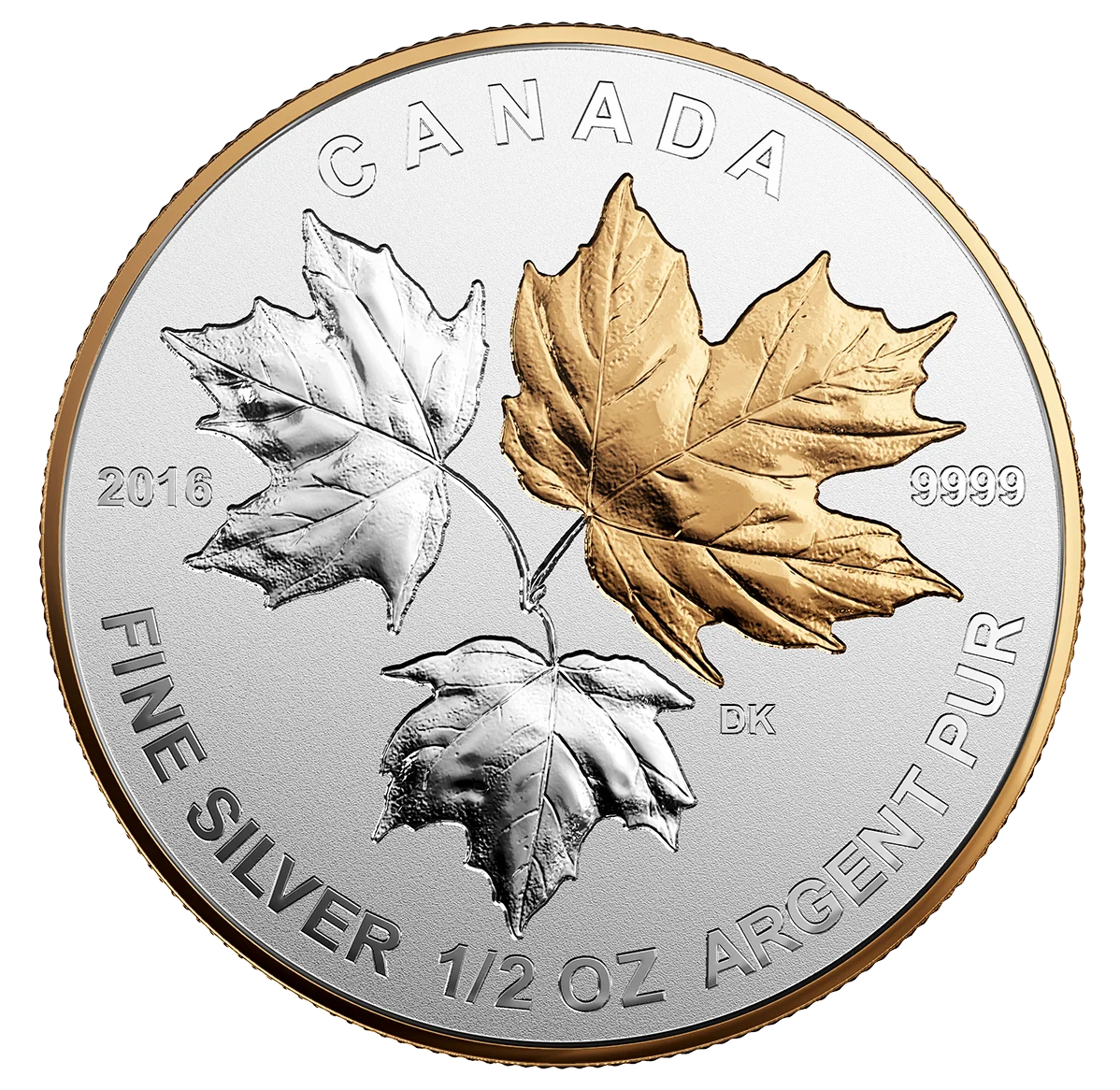 Three engraved maple leaves, the largest plated in pink gold, within a rim encircling "CANADA 2016."