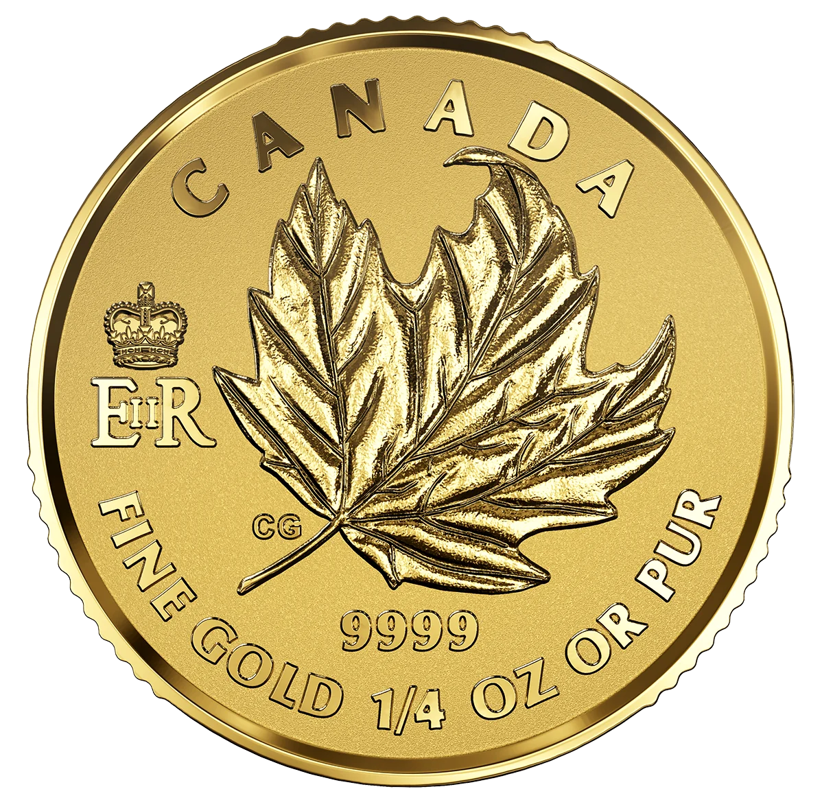 Three engraved maple leaves within a rim encircling "CANADA 2016." The largest leaf is pink gold-plated.