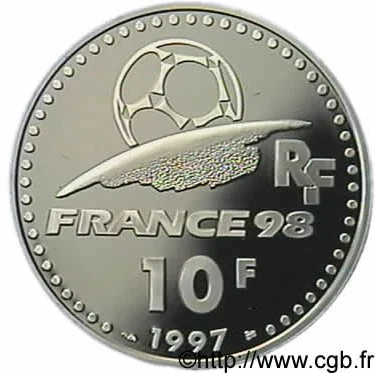 Sunrise football over Earth / Central "FRANCE 98" / Value below / Right "RF" / Year in outer ring.