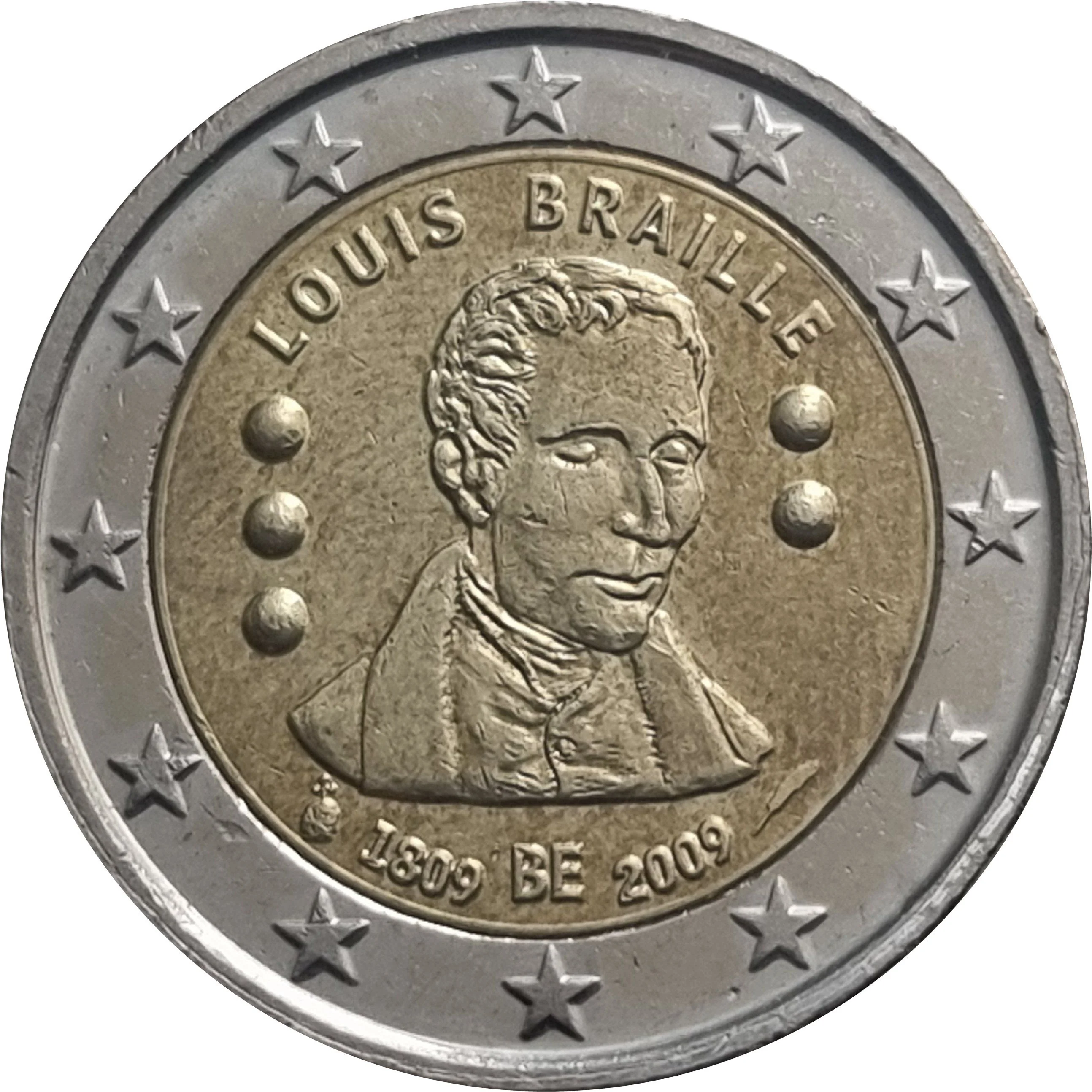 The coin depicts Louis Braille, with his initials in his alphabet and his name above. Below are the country code 'BE', the dates 1809-2009, the mint mark, and the master's signature. The outer ring features the 12 stars of the EU.