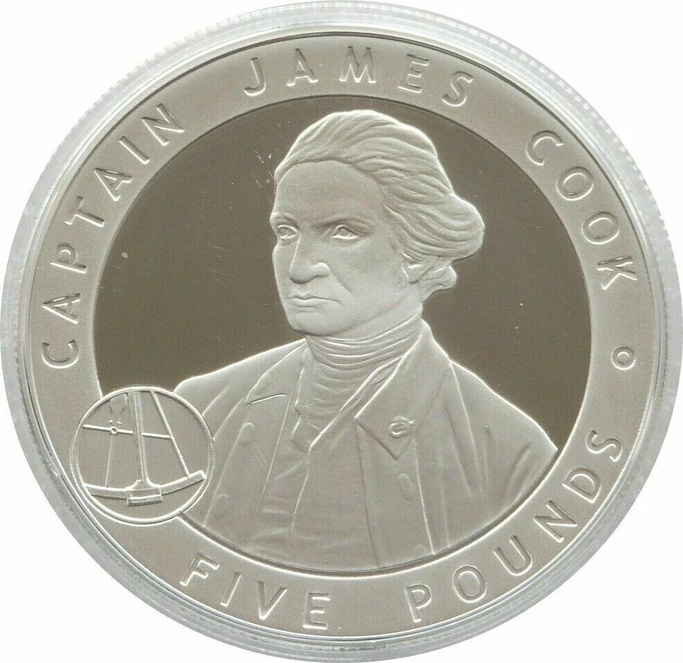 James Cook bust, cameo ship, denomination below.