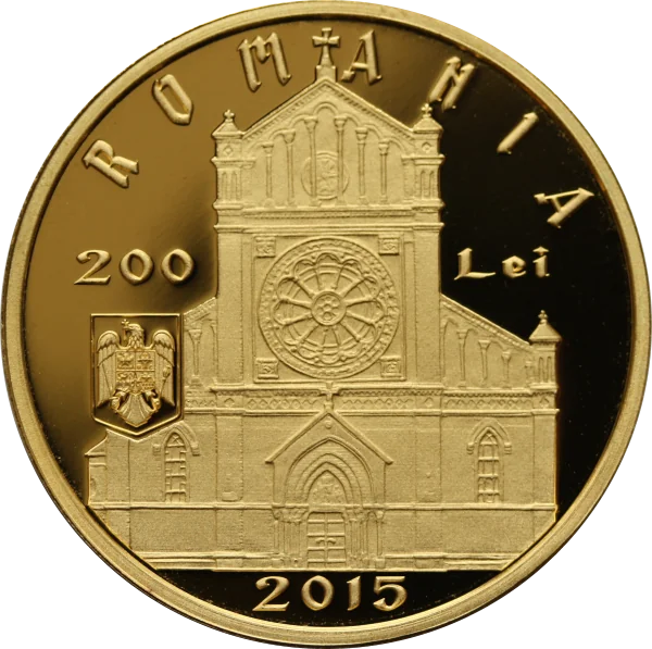 St. Joseph's Cathedral in Bucharest, "ROMANIA", 200 Lei, Romania's coat of arms, and the year 2015.