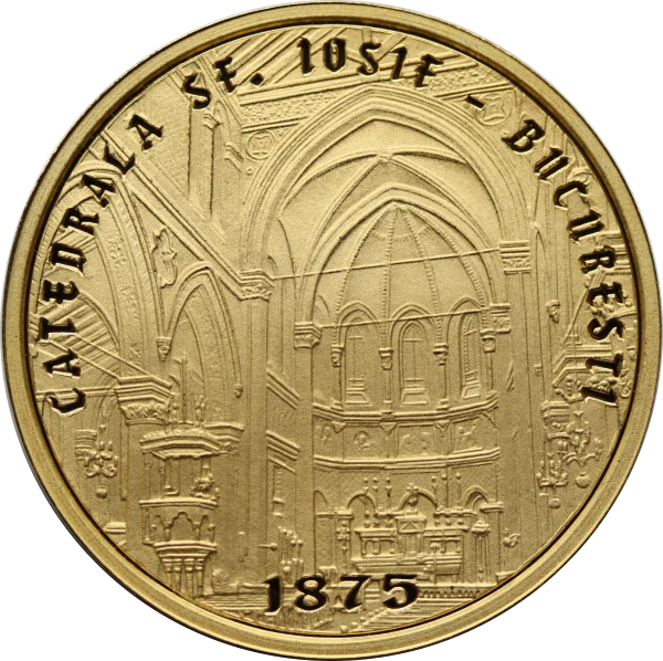 Inside Bucharest's St. Joseph’s Cathedral, an arched inscription reads “CATEDRALA SF. IOSIF - BUCURESTI” with the cornerstone year “1875”.