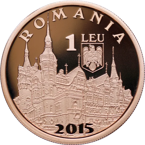 Peleș Castle, "ROMANIA," 1 LEU, Romania's coat of arms, and "2015."