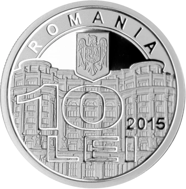 Romanian Intelligence Service headquarters, Romania's coat of arms, arched "ROMANIA", "10 LEI" face value, and issue year "2015".