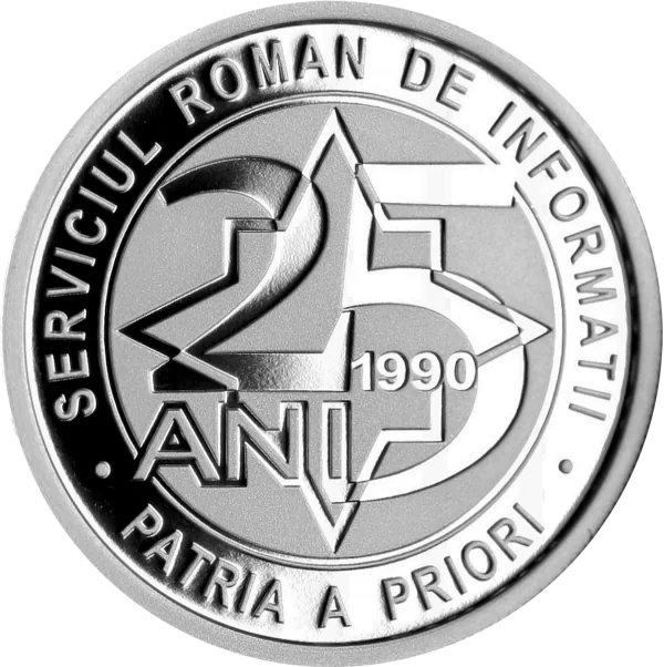 A graphic marking 25 years since the 1990 founding of the Romanian Intelligence Service, featuring its arched motto "PATRIA A PRIORI" and name "SERVICIUL ROMAN DE INFORMATII".