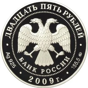 Center: Bank of Russia emblem (two-headed eagle with wings down, over "БАНК РОССИИ"), within a dotted circle. Rim inscription: top - "ДВАДЦАТЬ ПЯТЬ РУБЛЕЙ"; bottom left - metal and fineness, center - "2009 г.", right - metal content and mint mark.