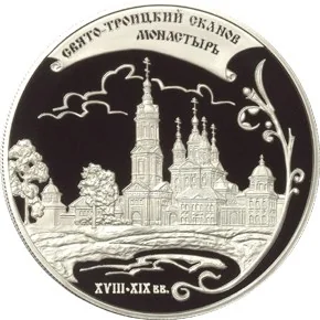 Monastery architectural ensemble. To the right, a stylized branch. Below, the dates "XVIII-XIX вв." Above, on a scroll: "СВЯТО-ТРОИЦКИЙ СКАНОВ МОНАСТЫРЬ".