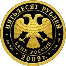 Center: Bank of Russia emblem (two-headed eagle with wings down, over "БАНК РОССИИ"), circled by dots. Rim inscriptions: top - "ПЯТЬДЕСЯТ РУБЛЕЙ"; bottom left - metal and fineness; center - "2009 г."; right - metal content and mint mark.