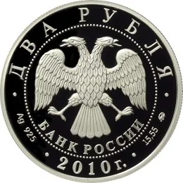 Center: Bank of Russia emblem (two-headed eagle, wings down, with "БАНК РОССИИ" below), within a dotted circle. Rim inscriptions: top - "ДВА РУБЛЯ"; bottom left - metal and fineness; center - "2010 г."; bottom right - metal content and mint mark.