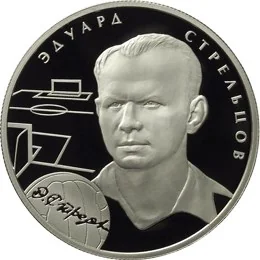 Left: stylized football field. Right: portrait of Eduard Streltsov. Below: a football with his facsimile signature. Above, along the rim: "ЭДУАРД СТРЕЛЬЦОВ".