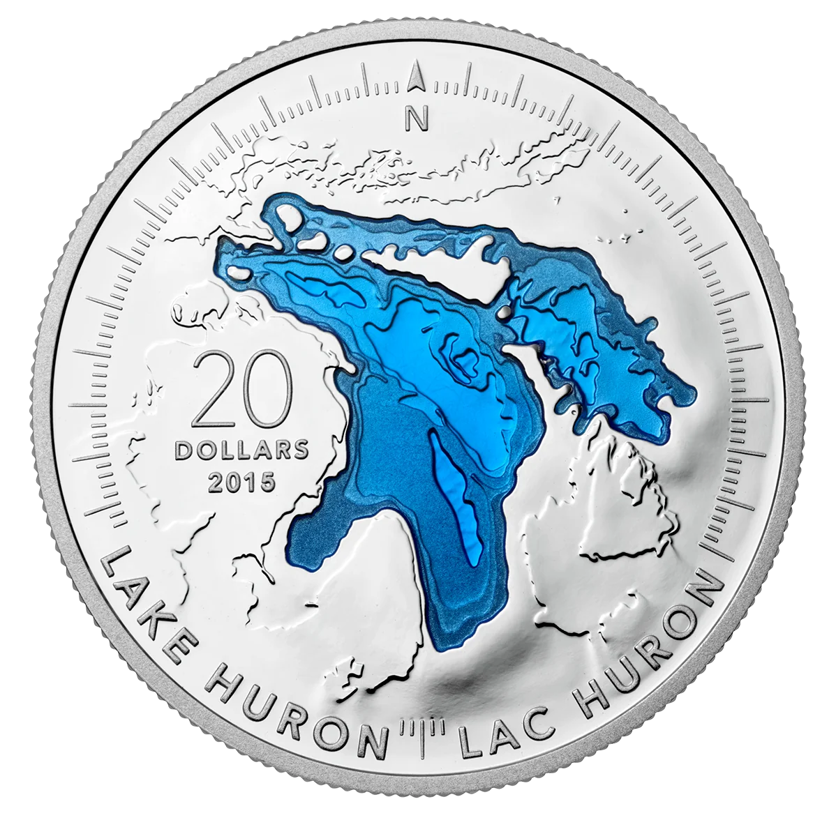 Lake Huron bathymetric map interpretation in blue enamel, with left-side date and value.