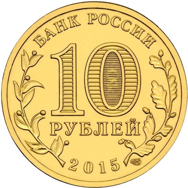 Center: "10 РУБЛЕЙ". Inside the "0", hidden images of "10" and "РУБ" appear as the angle changes. Around the rim: "БАНК РОССИИ" on top, "2015" below, with stylized laurel and oak branches on the left and right.