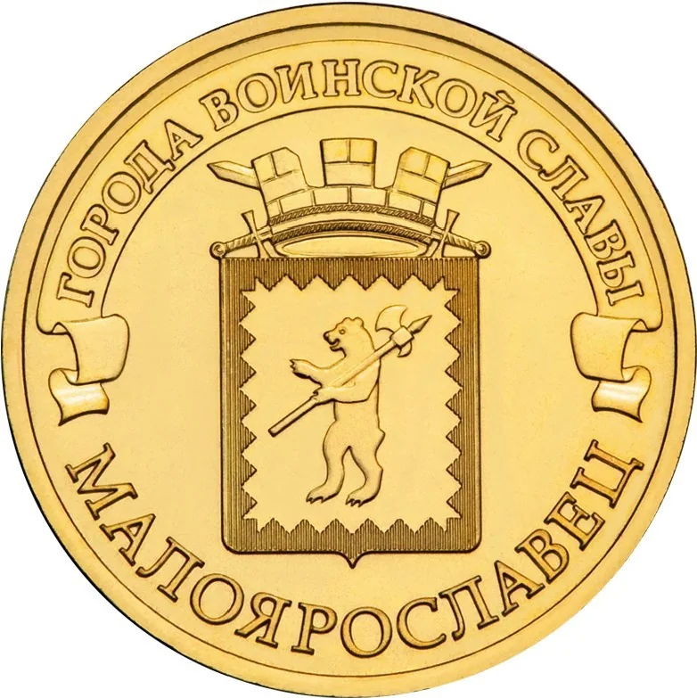 The Maloyaroslavets coat of arms, above it the semicircular inscription "ГОРОДА ВОИНСКОЙ СЛАВЫ", below the rim inscription "МАЛОЯРОСЛАВЕЦ".