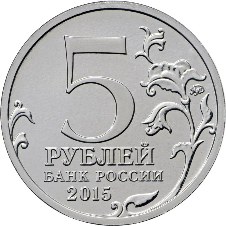 The center features "5 РУБЛЕЙ" above "БАНК РОССИИ" and the year "2015". Flanked by stylized plant twigs, the mint mark is at the right rim.
