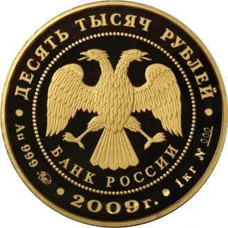 Below left: Metal, fineness, mint mark. Center: "2009 г.". Right: Metal weight and serial number №___.