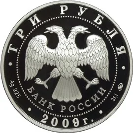 Center: Bank of Russia emblem (two-headed eagle, wings down, with "БАНК РОССИИ" below), within a dotted circle. Rim inscriptions: top - "ТРИ РУБЛЯ"; bottom left - metal and fineness; center - "2009 г."; bottom right - metal content and mint mark.