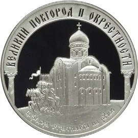 Center: St. Theodor Stratilates Church on the Brook. Left: warriors. Inscriptions: above, "ВЕЛИКИЙ НОВГОРОД И ОКРЕСТНОСТИ"; below, "Ц.ФЕДОРА СТРАТИЛАТА НА РУЧЬЮ".
