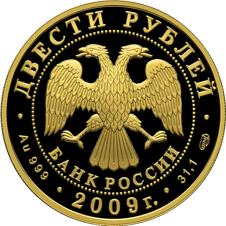 Center: Bank of Russia emblem (two-headed eagle with wings down, "БАНК РОССИИ" below), within a dotted circle. Rim inscriptions: top - "ДВЕСТИ РУБЛЕЙ"; bottom left - metal and fineness, center - "2009 г.", right - fine metal content and mint mark.