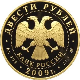 Center: Bank of Russia emblem (two-headed eagle, wings down, with "БАНК РОССИИ" below) inside a dotted circle. Rim inscription: top - "ДВЕСТИ РУБЛЕЙ"; bottom left - metal and fineness; center - "2009 г."; bottom right - metal content and mint mark.