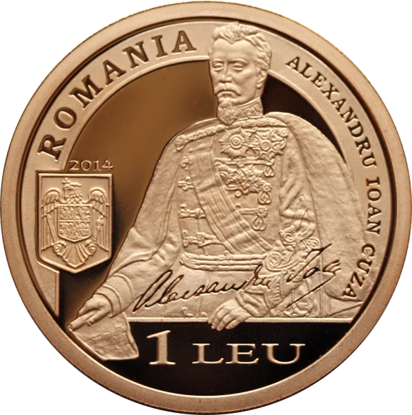 Portrait, signature, and name of Prince Alexandru Ioan Cuza; the inscription "ROMANIA"; the year "2014"; Romania's coat of arms; and the face value "1 LEU".