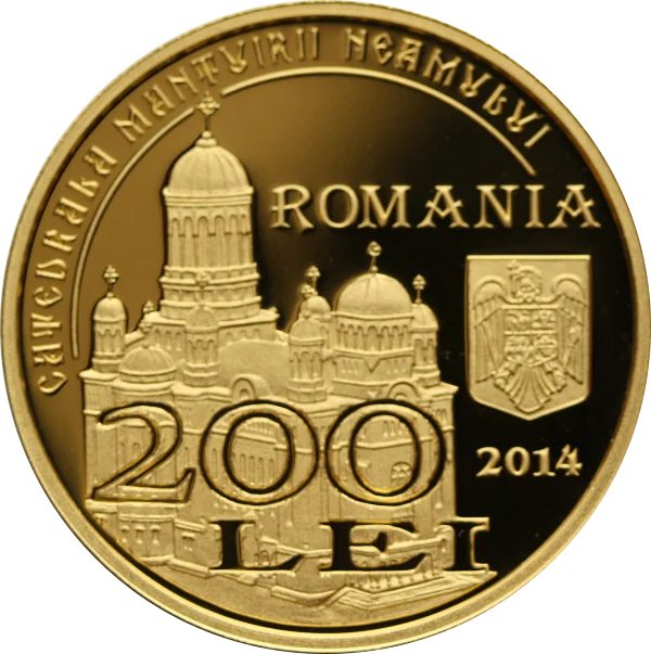 Romanian People’s Salvation Cathedral scale model, Romania's coat of arms, "200 LEI" face value, issue year 2014, and inscriptions "CATEDRALA MANTUIRII NEAMULUI" and "ROMANIA".