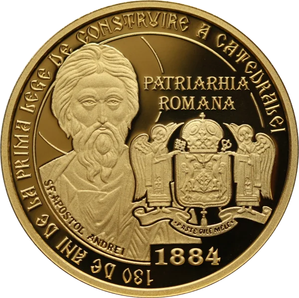 Featuring St. Andrew the Apostle, the Romanian Patriarchate's coat of arms, and the inscriptions "PATRIARHIA ROMANA," "130 DE ANI DE LA PRIMA LEGE DE CONSTRUIRE A CATEDRALEI," and the year "1884."