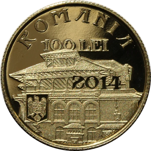 The Florica mansion, birthplace of Ion I.C. Brătianu, with "ROMANIA" in an arc, the 100 LEI face value, Romania's coat of arms, and the issue year 2014.