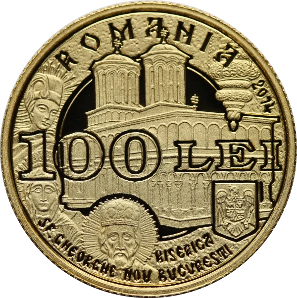 St. George’s New Church in Bucharest, featuring icons of Saints George, Parascheva, and Nicholas; the oil lamp above Prince Brâncoveanu’s tomb inside; Romania’s coat of arms; the year 2014 and face value of 100 LEI. The outer ring bears "ROMANIA" and "BISERICA SF. GHEORGHE NOU BUCURESTI".