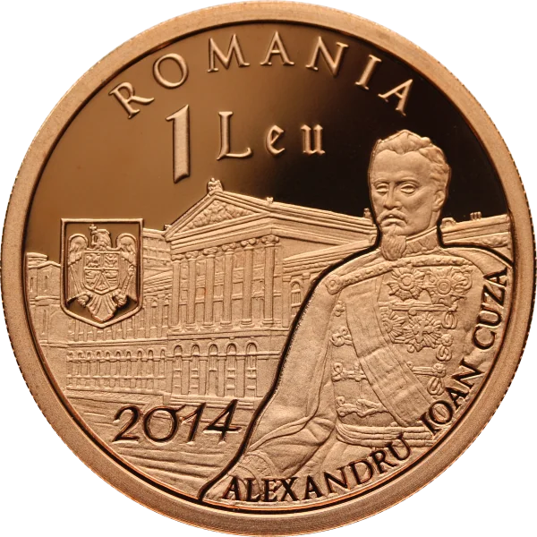 1864 University of Bucharest portrait of founder Alexandru Ioan Cuza, arched inscriptions "ROMANIA" and "ALEXANDRU IOAN CUZA", face value "1 Leu", Romanian coat of arms, and issue year "2014".