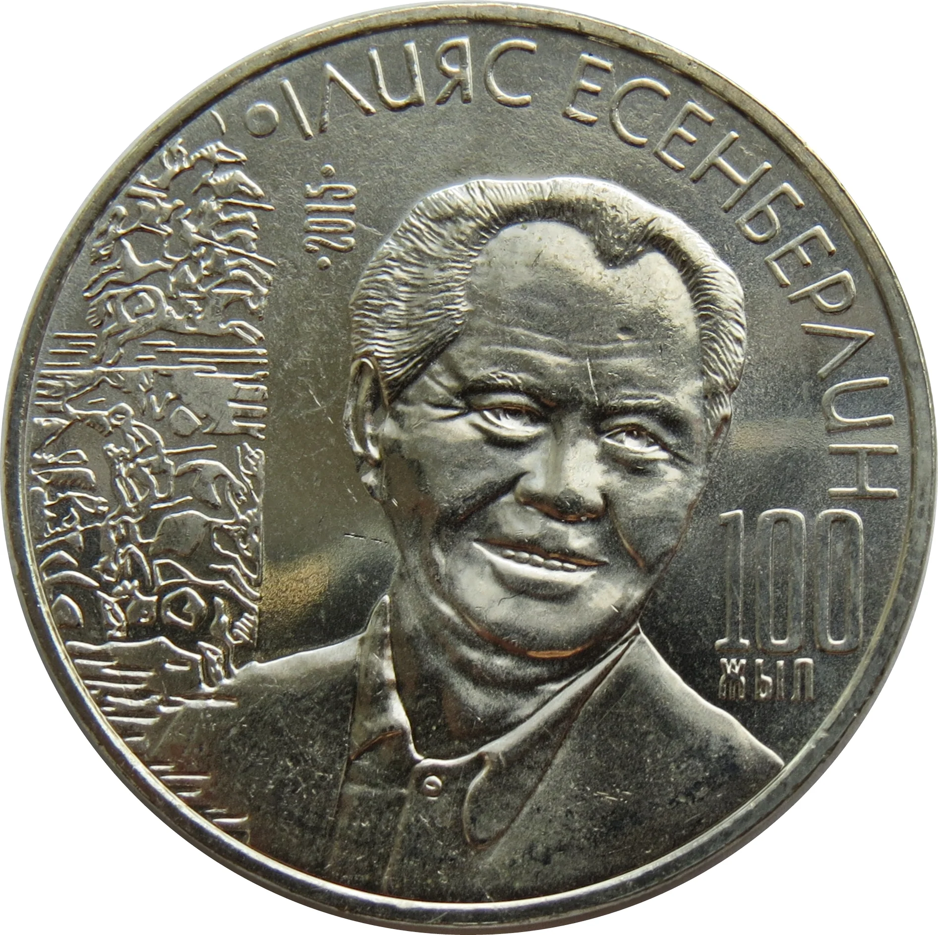 Description: A coin honoring Ilyas Esenberlin, Hero of the Soviet Union, writer, and public figure. It features the inscription "100 ЖЫЛ" at left, "ІЛИЯС ЕСЕНБЕРЛИН" around the edge, and the year "2015."