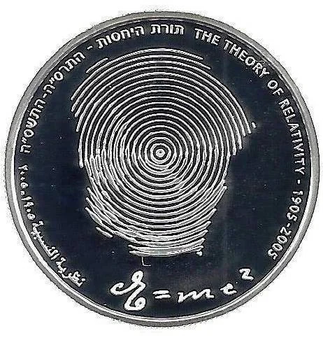Elliptic orbits and Israel's emblem. "Israel" in three languages, Star of David, and Hebrew University emblem. "Einstein Year 2005" on the left border; denomination on the right. Features Einstein's signature.