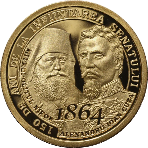 Portraits of Prince Alexandru Ioan Cuza and Metropolitan Nifon, their names, the arched inscription "150 DE ANI DE LA INFIINTAREA SENATULUI," and the year "1864."