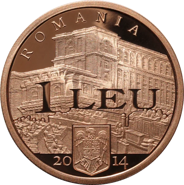 Parliament Palace in Bucharest during a Senate session, featuring Romania's coat of arms, "2014" issue year, "1 LEU" face value, and the arched inscription "ROMANIA".