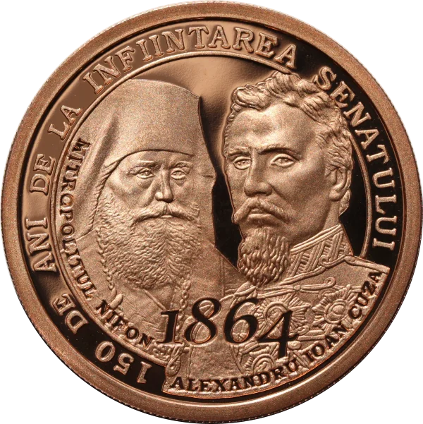 Portraits of Prince Alexandru Ioan Cuza and Metropolitan Nifon, their names, the arched inscription "150 DE ANI DE LA INFIINTAREA SENATULUI," and the year "1864."