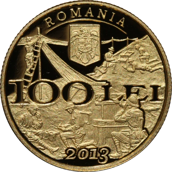 World War I signallers installing battlefield communications – based on a metope from Bucharest's "Lion" Monument. Features an arched "ROMANIA" inscription, the national coat of arms, face value "100 LEI", and year "2013".