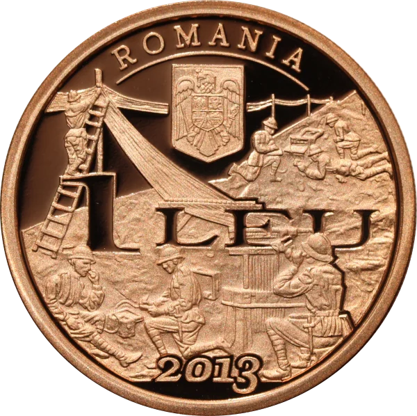 World War I military signallers installing battlefield communications lines, reproduced from a metope on Bucharest's "Lion" Monument. Featuring "ROMANIA," the national coat of arms, face value "1 LEU," and year "2013."