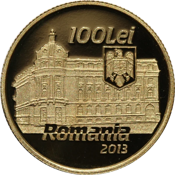 Bucharest University of Economic Studies; 100 Lei face value; Romania's coat of arms, country name, and 2013 issue year.