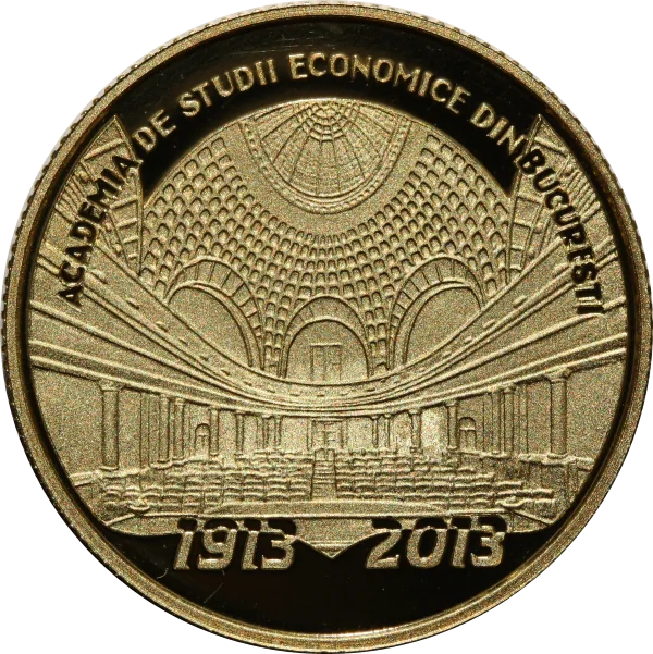 The Aula Magna of the Bucharest University of Economic Studies, featuring its arched name, founding year "1913," and centennial year "2013."